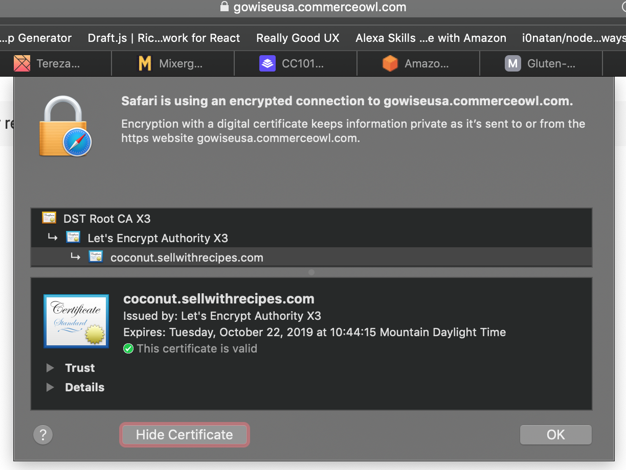 evoo2.commerceowl.com, Common Name in the cert ends up beingcoconut.sellwithrecipes.com(http-01 authed custom domain). See screenshot.Thoughts on how approveDomains is causing this issue?